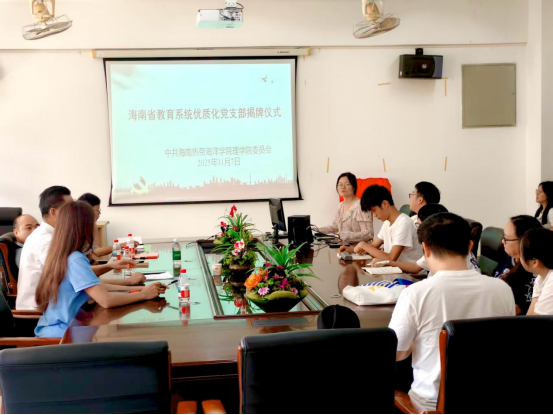 揭牌仪式上,廖余燕同志宣读海南省教育系统优质化党支部入选文件并向大家通报了优质化党支部的建设、申报过程。她代表支部表示很荣幸获得此项荣誉,这是支部全体党员在上级党委正确领导下,团结奋斗、锐意进取的成果,支部全体党员同志一定再接再厉,向着建设特色化党支部的目标努力迈进。