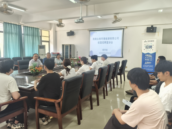 为切实做好2026届毕业生就业工作,进一步拓宽就业渠道,精准搭建企业与毕业生双向选择的互动桥梁,助推毕业生实现充分就业、高质量就业,4月8日下午,海南众科环境检测有限公司质量负责人宫国辉、人事部经理罗玉拆一行,莅临我院9403会议室开展2026届毕业生校园招聘宣讲会。我院相关专业辅导员、2026届化学专业在校学生参加宣讲会,学院党委副书记黄宇志主持会议。